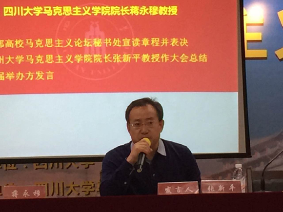 9月24-25日,张新平教授一行参加了在四川大学举行的首届中国西部高校马克思主义论坛,中国西部高校马克思主义论坛是在教育部社会科学司指导下,由兰州大学马克思主义学院、四川大学马克思主义学院、西安交通大学马克思主义学院、西南大学马克思主义学院发起成立,旨在为西部地区高校搭建一个马克思主义理论学科建设、教育教学、科学研究和理论宣传的交流合作平台。在为期两天的论坛上,与会专家通过主题发言、分组讨论等方式,围绕“马克思主义学院建设”、“思想政治理论课课程建设”、“马克思主义理论学科建设”、“多媒体技术的理念与应用创新”等问题展开了深入研讨和交流,在学科建设、教育教学、理论宣传、学院建设、社会服务等诸多方面取得了重要共识。杨宏伟教授主持了第二阶段的大会主题发言。论坛闭幕式上通过了《中国西部高校马克思主义论坛章程》,我校马院同其他三家发起单位一道被推举为论坛理事长单位。最后,张新平教授做了大会总结。大会决定,第二届论坛将于2017年在西南大学举办。2018年,兰大马院将于马克思主义基础本科专业设立30周年、学院成立10周年之际承办第三届论坛。