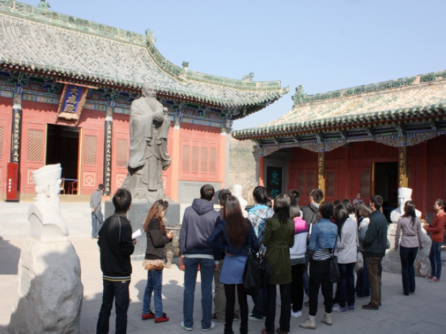 仪式结束后,兰州国学馆的解说工作人员带领大家参观并详细介绍了国学馆馆藏经典。兰州国学馆依托皋兰县文庙古建筑群改建而成,它不仅包括传统的儒学思想,也涵盖了道家、法家及自然科学等各方面的内容。馆内设施基本完善,按文庙建筑通制,沿中轴线依次布设棂星门、泮池、戟门、明伦堂、大成殿、尊经阁、崇圣祠,东西两侧是礼乐亭和曲廊,荟萃中华名篇经典的碑墙和神态各异的古名人塑像别具一格。通过参观学习,师生们了解到了兰州国学馆丰厚的国学底蕴,也上了一堂别开生动的国学教育课。