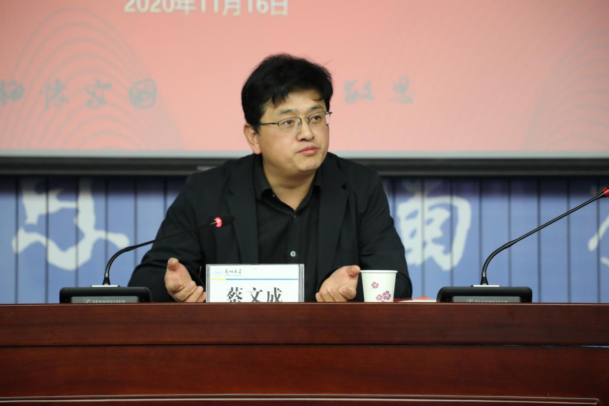 最后,蔡文成做总结发言。他从树立学术目标、培养学术兴趣、锻炼学术能力、提升学术素养、勇担学术责任等五个方面提出学术研究学习建议。从严格过程管理、提升学术竞争力等方面提出了研究生学习科研要求。