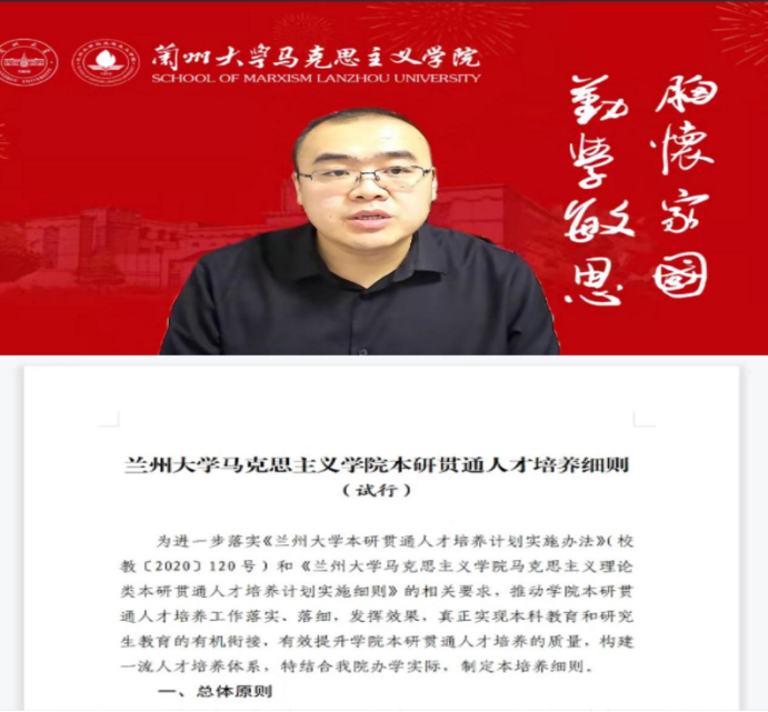 为进一步落实《兰州大学本研贯通人才培养计划实施办法》(校教〔2020〕120号)和《兰州大学马克思主义学院马克思主义理论类本研贯通人才培养计划实施细则》的相关要求,明确培养目标,完善培养体系,创新培养方式,推动学院本研贯通人才培养工作落实、落细,发挥实效,10月28日晚,马克思主义学院在线举行“本研贯通人才培养计划工作推进会暨师生论坛”。学院院长蔡文成,副院长杨宏伟、杨志超、李东坡,系主任夏淼、宫长瑞,2020级本研贯通人才培养导师组全体导师、2020级本科班主任、教学秘书、辅导员,以及入选本研贯通计划7位本科生参与了此次活动。会议由副院长杨志超主持。
