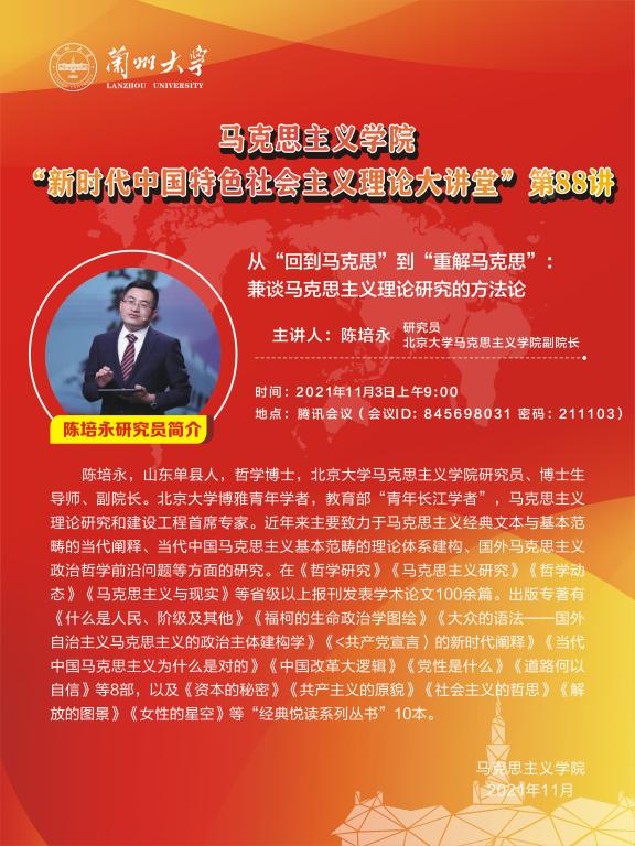 应兰州大学马克思主义学院邀请,北京大学马克思主义学院副院长陈培永将于2021年11月3日在线上作学术讲座,欢迎广大师生参加!
