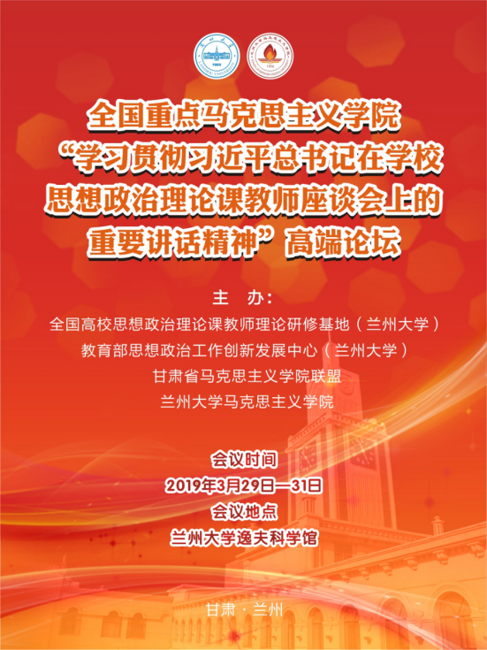 为深入学习贯彻习近平总书记在学校思想政治理论课教师座谈会上的重要讲话精神,全面贯彻党的教育方针,落实立德树人的根本任务,理直气壮开好思政课,用习近平新时代中国特色社会主义思想铸魂育人,切实提高高校思政课教学质量,科学提升大学生对思政课的获得感,努力培养担当民族复兴大任的时代新人,培养德智体美劳全面发展的社会主义建设者和接班人,我校拟于2019年3月29日——31日举办全国重点马克思主义学院“学习贯彻习近平总书记在学校思想政治理论课教师座谈会上的重要讲话精神”高端论坛,研讨新时代高校思想政治理论课建设与改革、交流全国马克思主义学院思想政治理论课建设经验与成功做法。