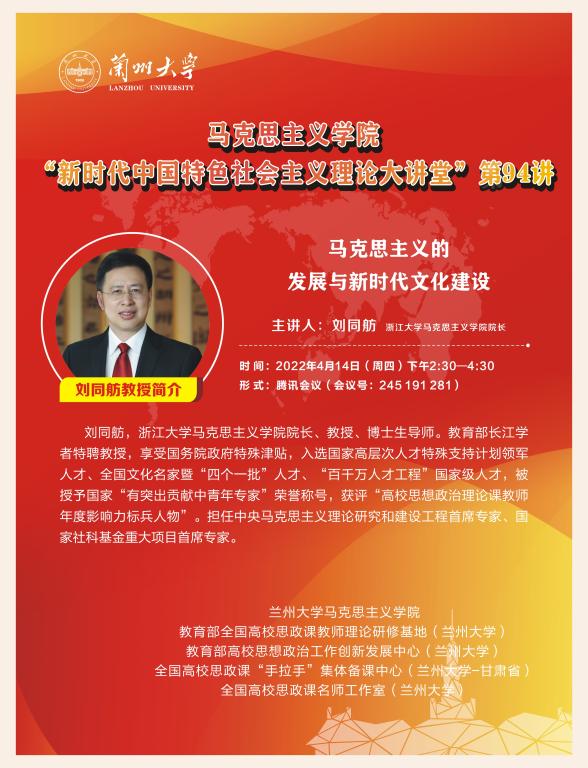 应兰州大学马克思主义学院邀请,浙江大学马克思主义学院院长、教育部“长江学者”特聘教授刘同舫将于2022年4月14日(周四)在线上作学术讲座,欢迎广大师生参加!